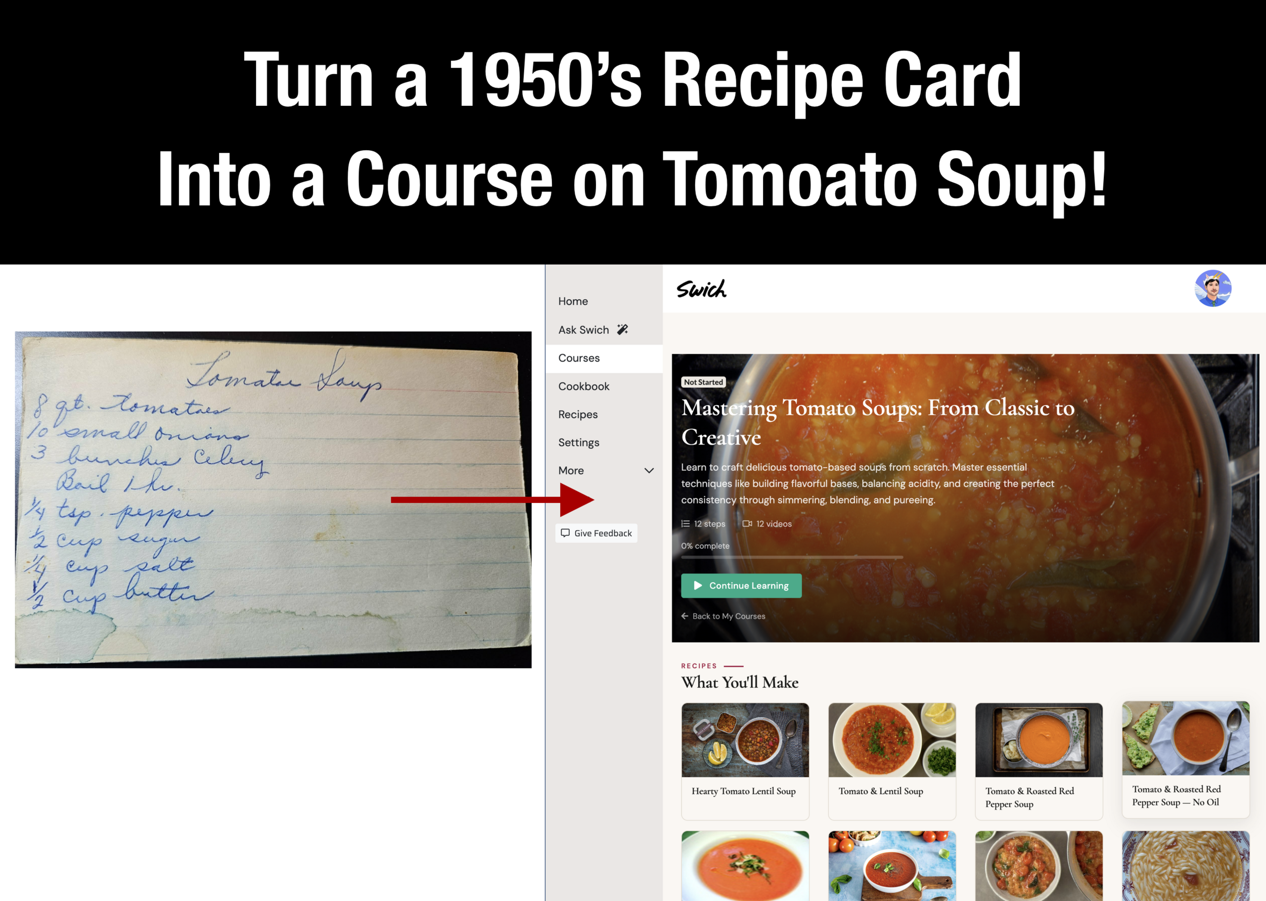 Swich draws on two decades of professional culinary school content — thousands of techniques, hundreds of foundational recipes, built and refined by trained chefs. When our AI saw that handwritten card, it didn't just transcribe it. It identified the core skills the recipe relied on and assembled a course designed specifically to make that soup beautifully.