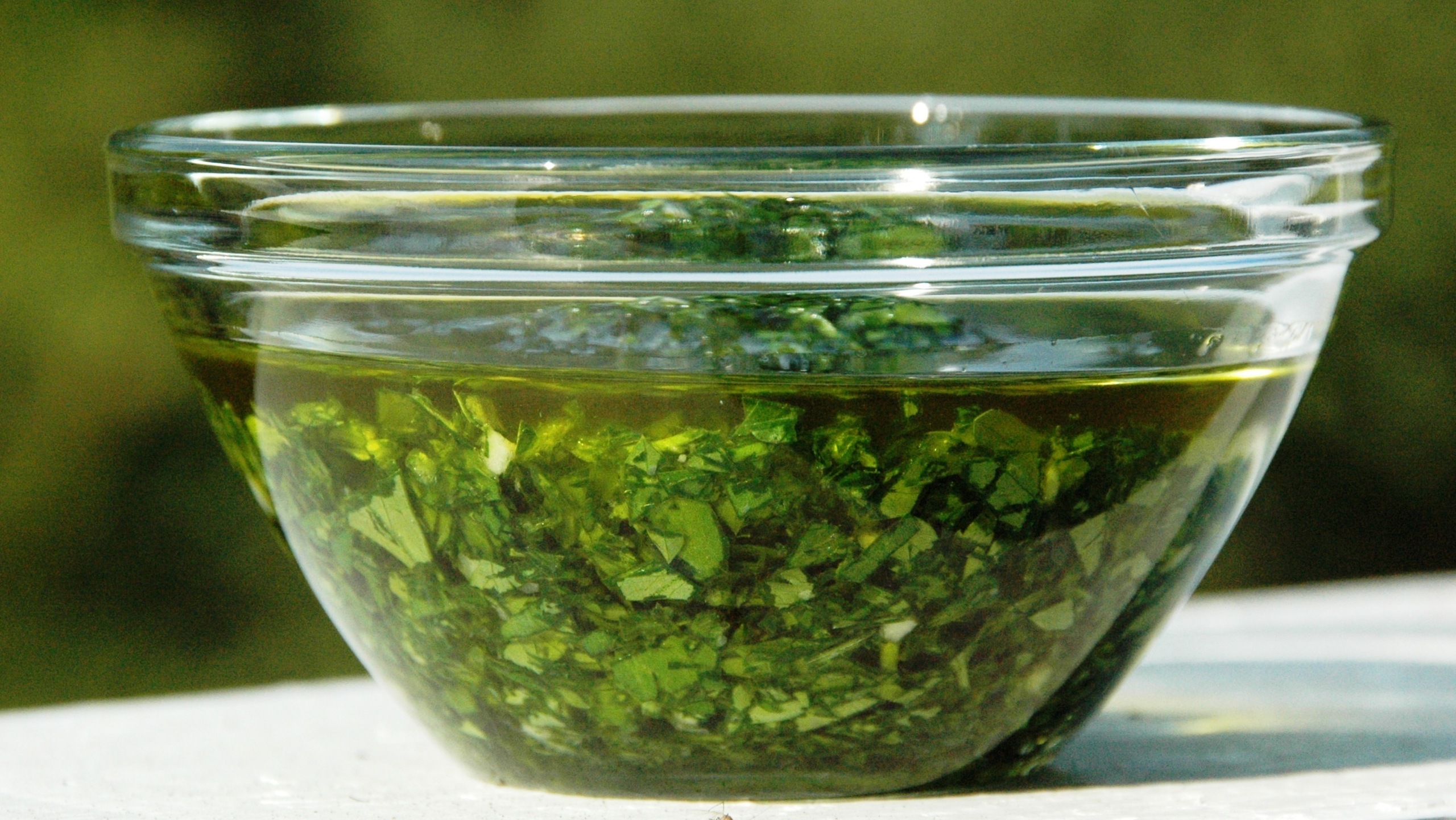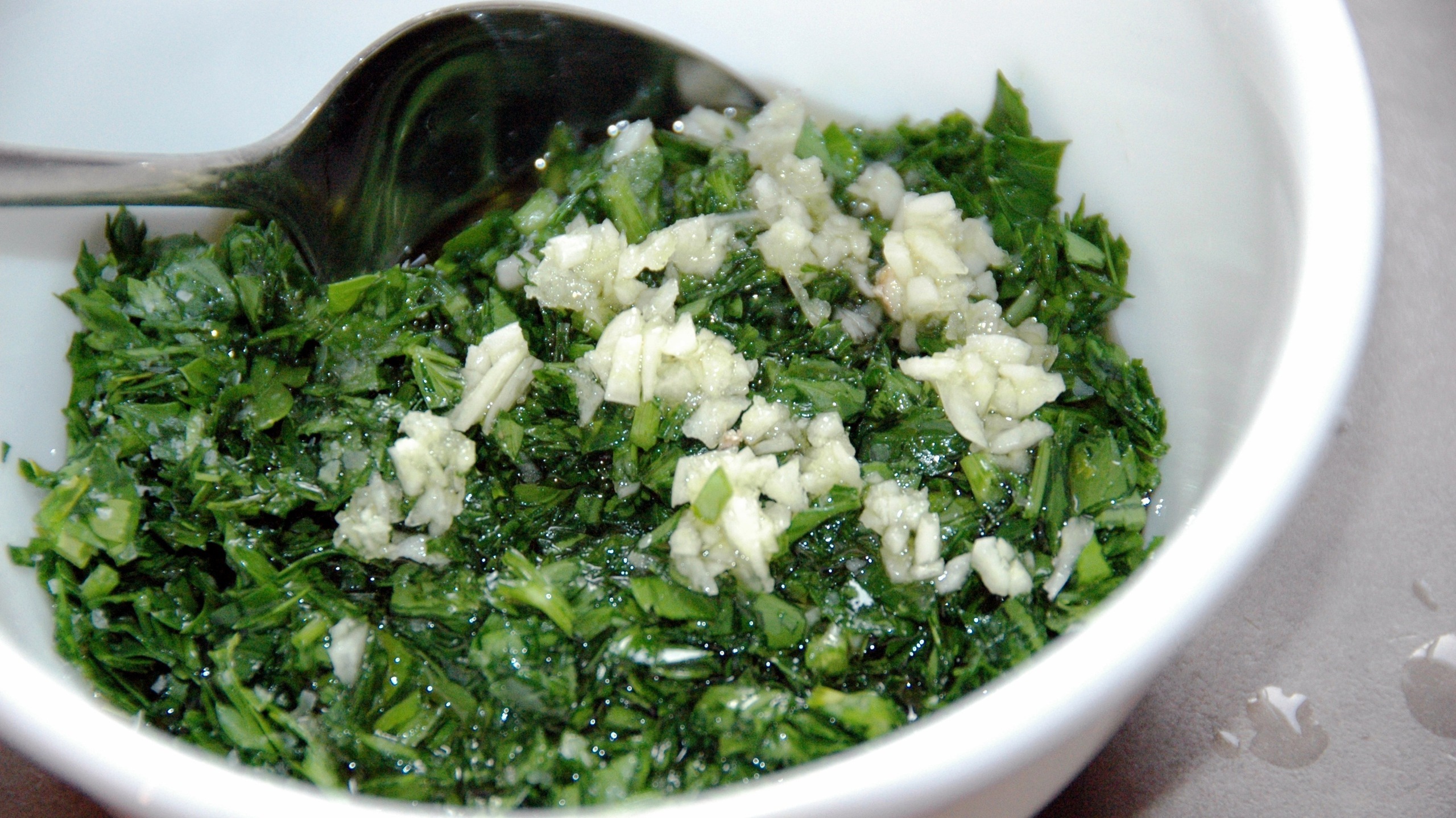 To prepare the salsa verde, first clean and dry the parsley. Remove the leaves from the stem (save the stems for making stock) and finely chop. Place into a bowl. Next, mince the garlic. Add to the parsley, along with the olive oil. Mix to combine. Season with the salt to taste. Set aside.