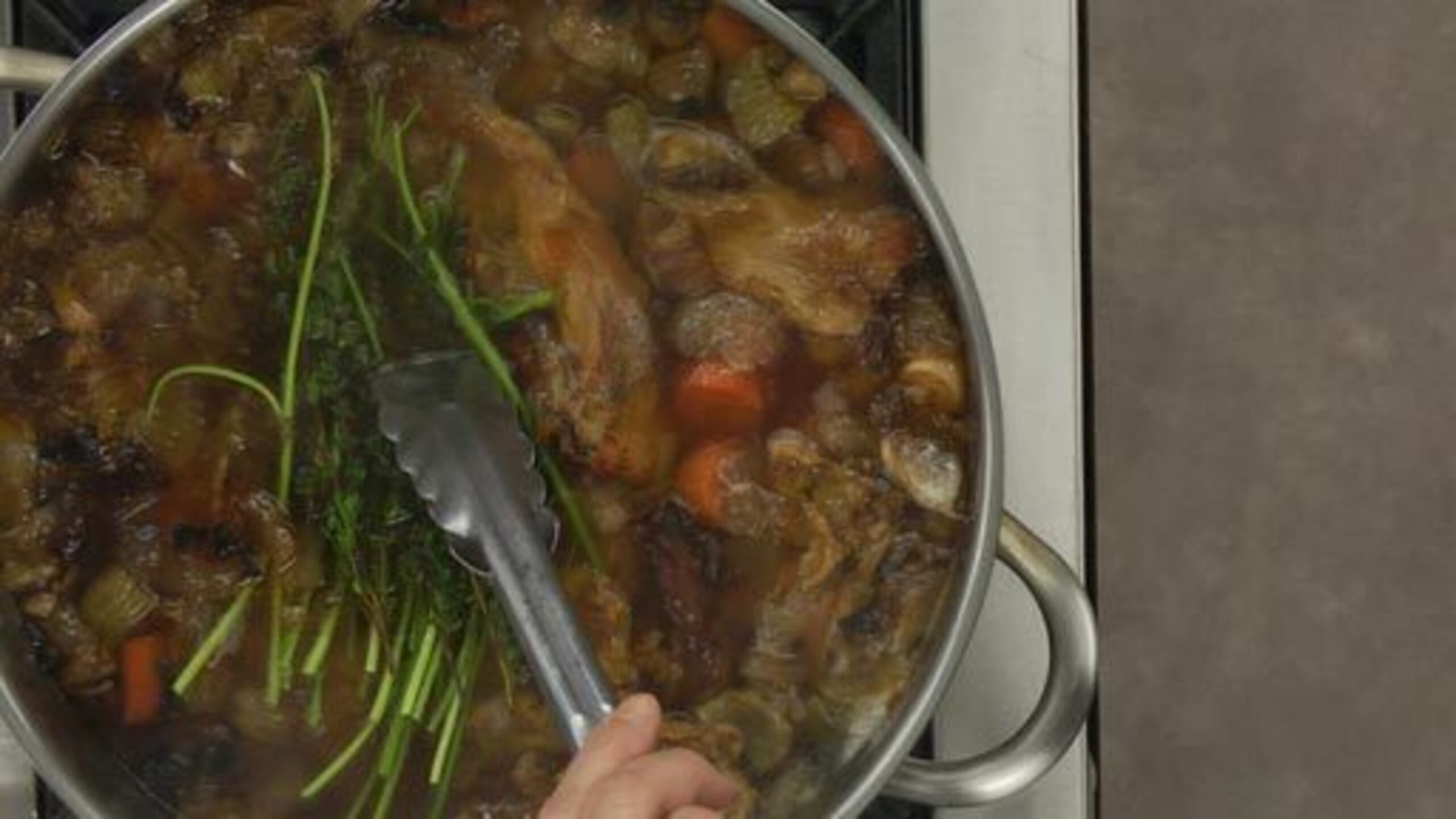About 30 minutes before the stock has finished cooking, add the bouquet garni and continue to simmer.