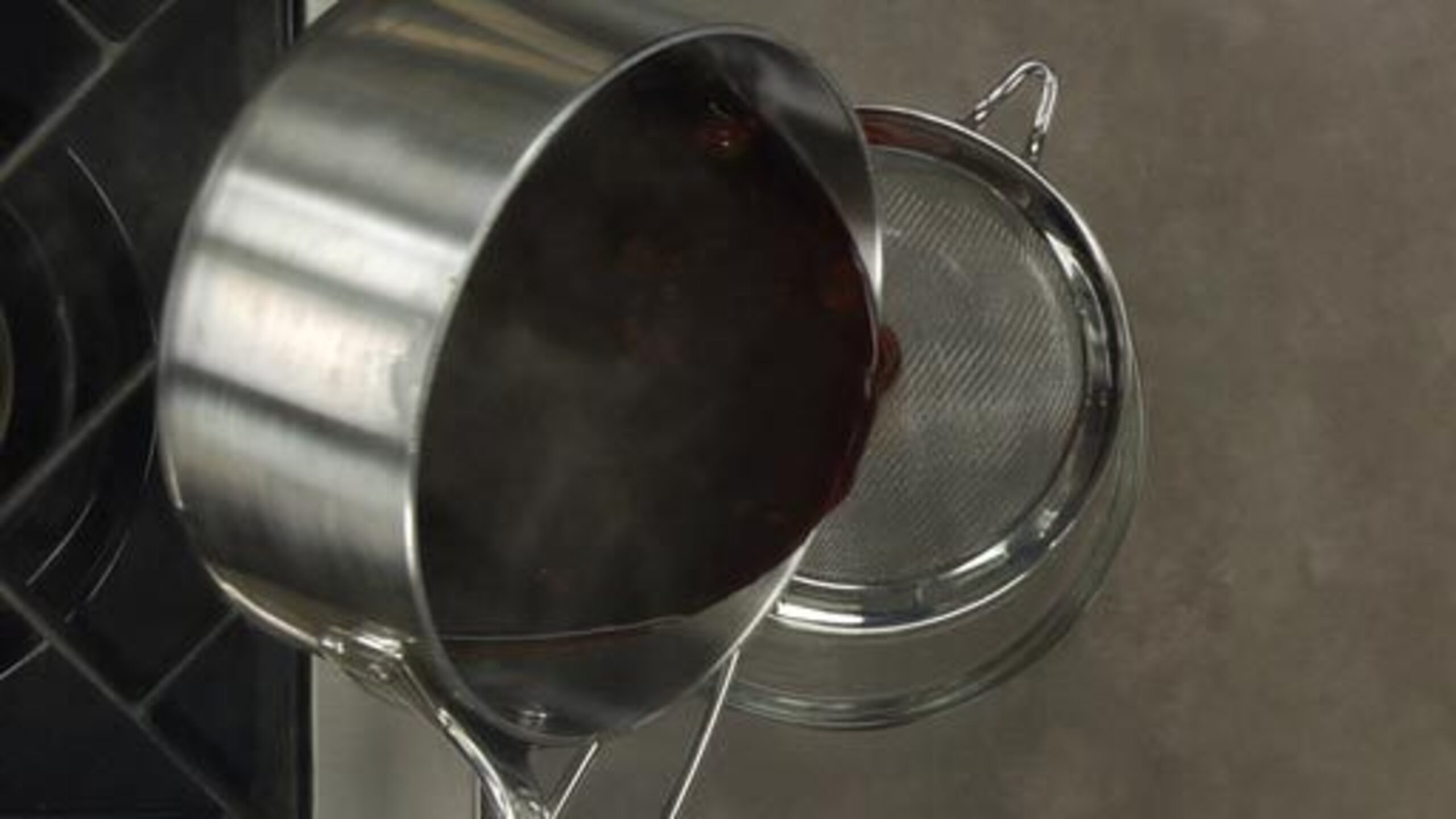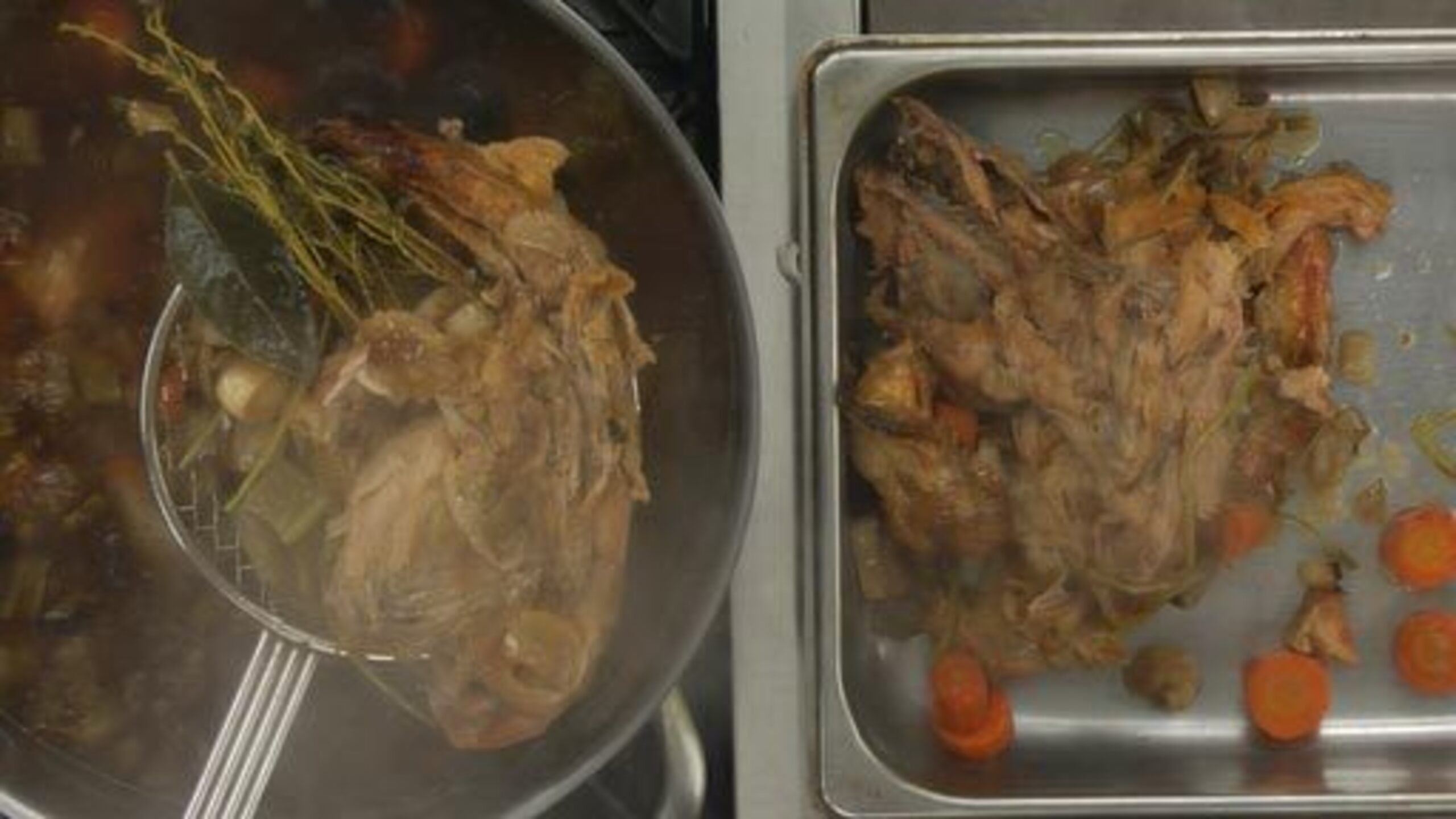 Once the stock has finished cooking, gently remove the bones and mirepoix using a spider. Strain the stock through a sieve lined with cheesecloth.