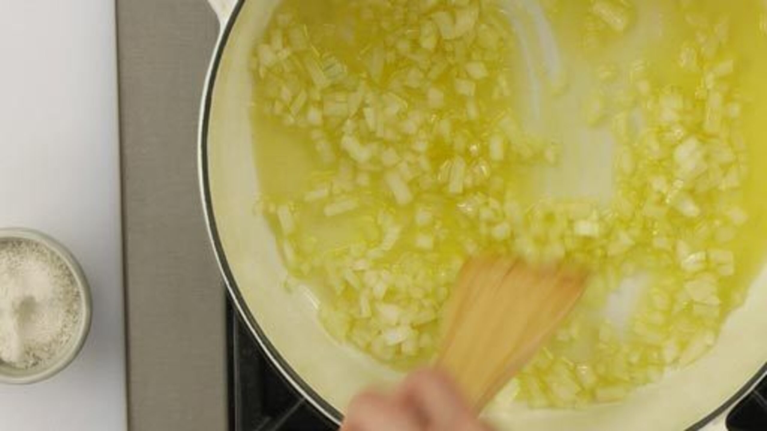 To start the sauce, heat a heavy-bottomed pot over medium-low heat. Then add the oil, followed by the onions. Next, add a pinch of salt and let the onions gently cook until they soften and just begin to turn a slight golden color.