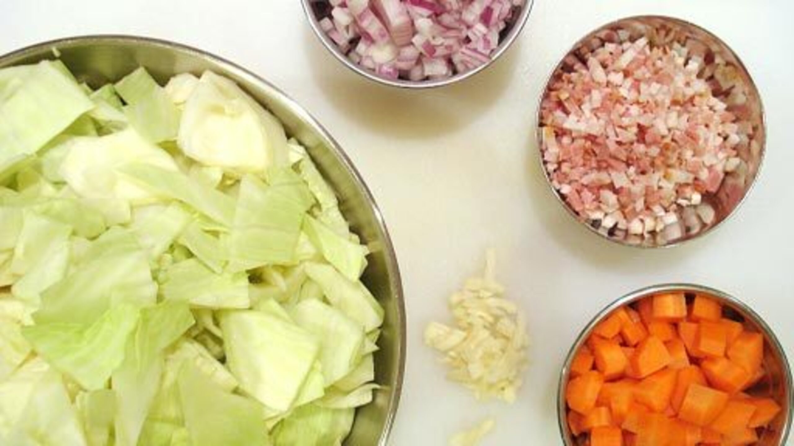 To prepare your mise en place, slice the onion into small dice and emince the garlic. Peel the carrot and cut into medium-dice. Remove the core from the cabbage and cut into chunks about 3/4" -inch x 1 1/2 "-inch. Remove the seeds from the whole tomatoes and roughly chop. Gather the chili flakes and set everything aside.