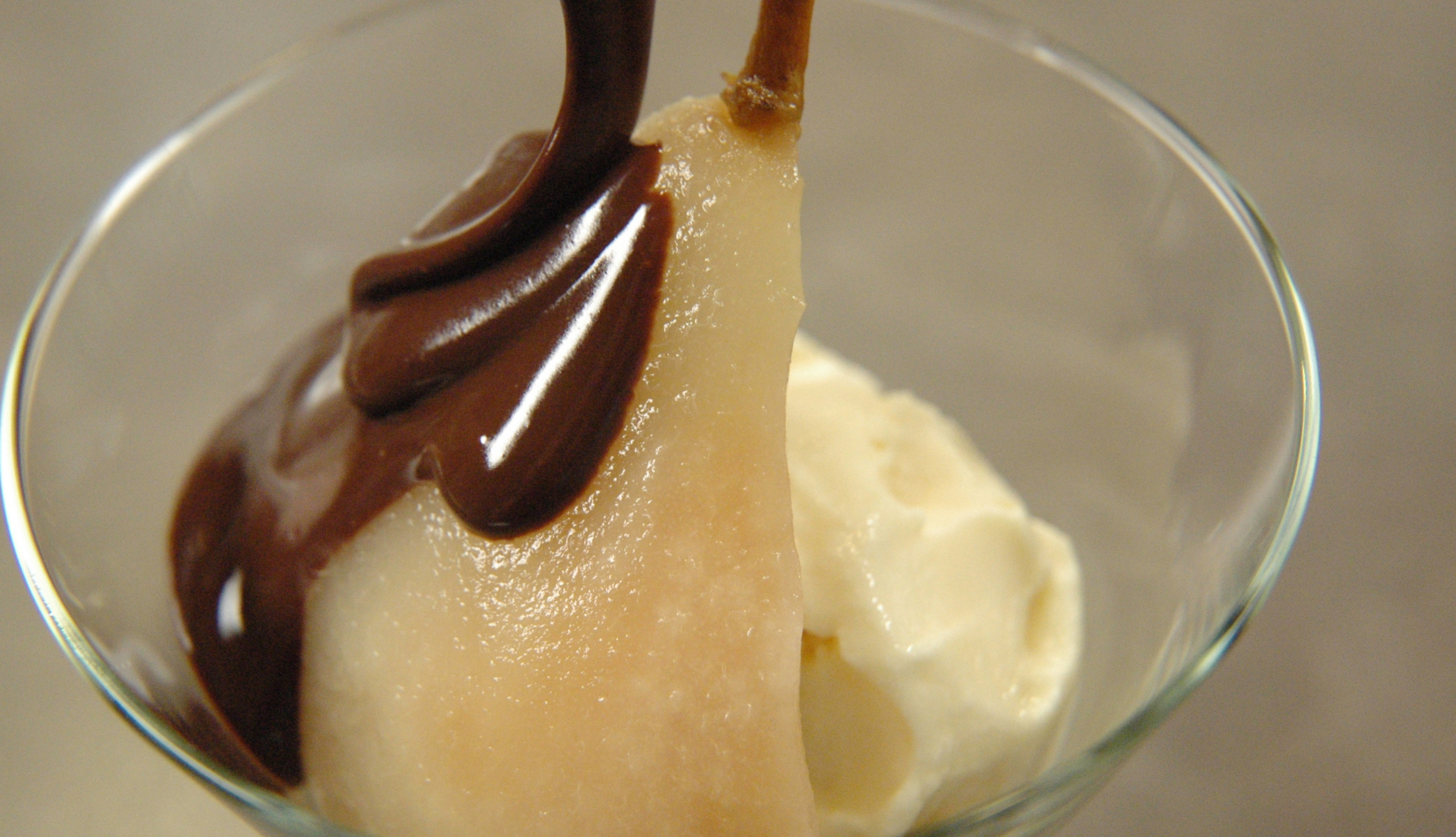 To assemble the dish, place a scoop of vanilla ice cream in the bottom of a serving glass or bowl. Place a poached pear over top. Drizzle with warm chocolate sauce.
