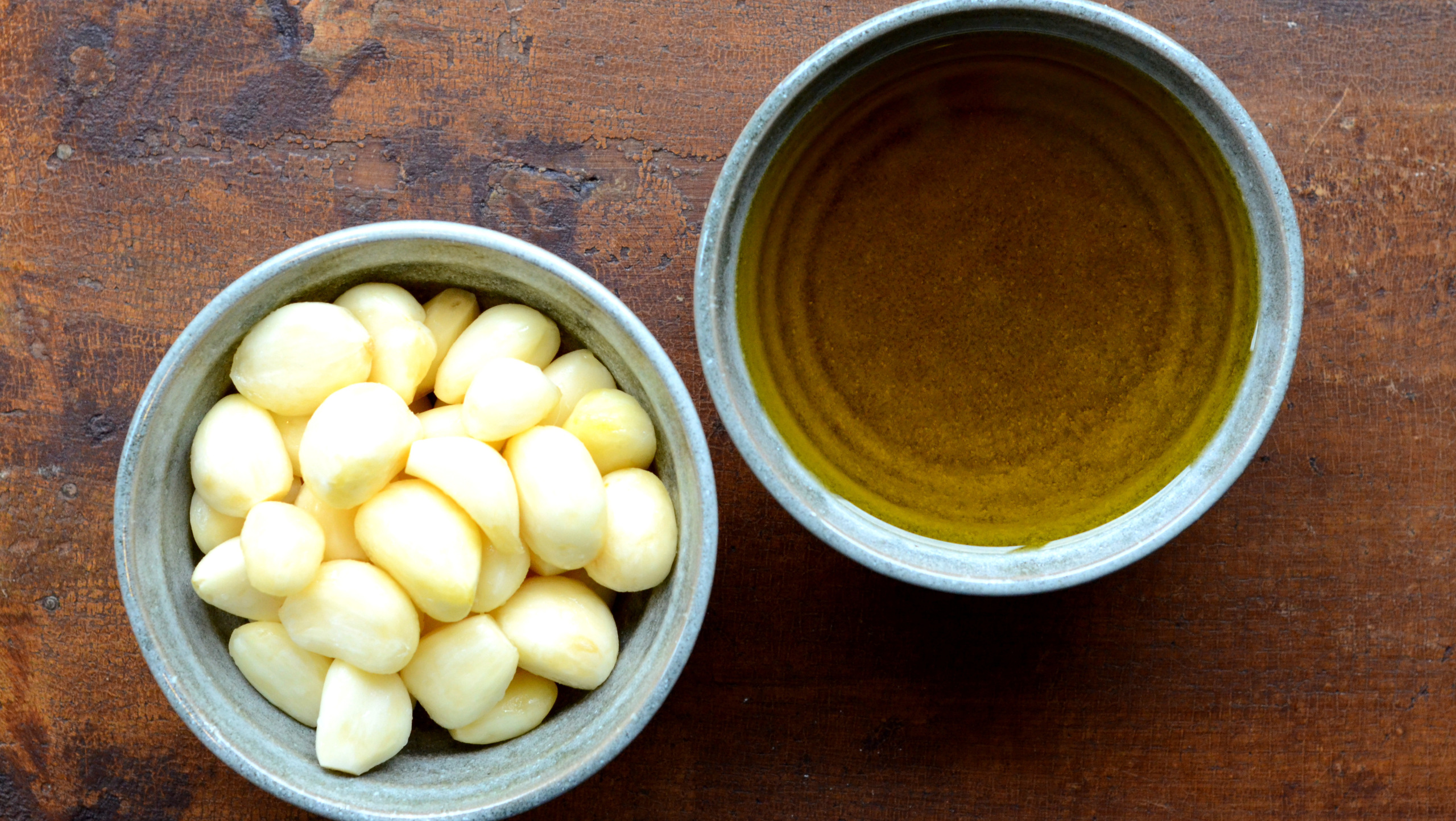 Heat the garlic over low heat. The oil should not reach above 210°F (100°C) and only small bubbles should form. As the oil heats up, bits of skin may float to the surface; skim them with a mesh strainer. Gently cook the garlic for 40 to 45 minutes, or until it is very tender and the cloves look pale-golden. Remove pan from the heat and set aside. Let the cloves cool in the oil. Strain the oil into a sealable container and add the cloves of garlic. Refrigerate for one to two weeks.